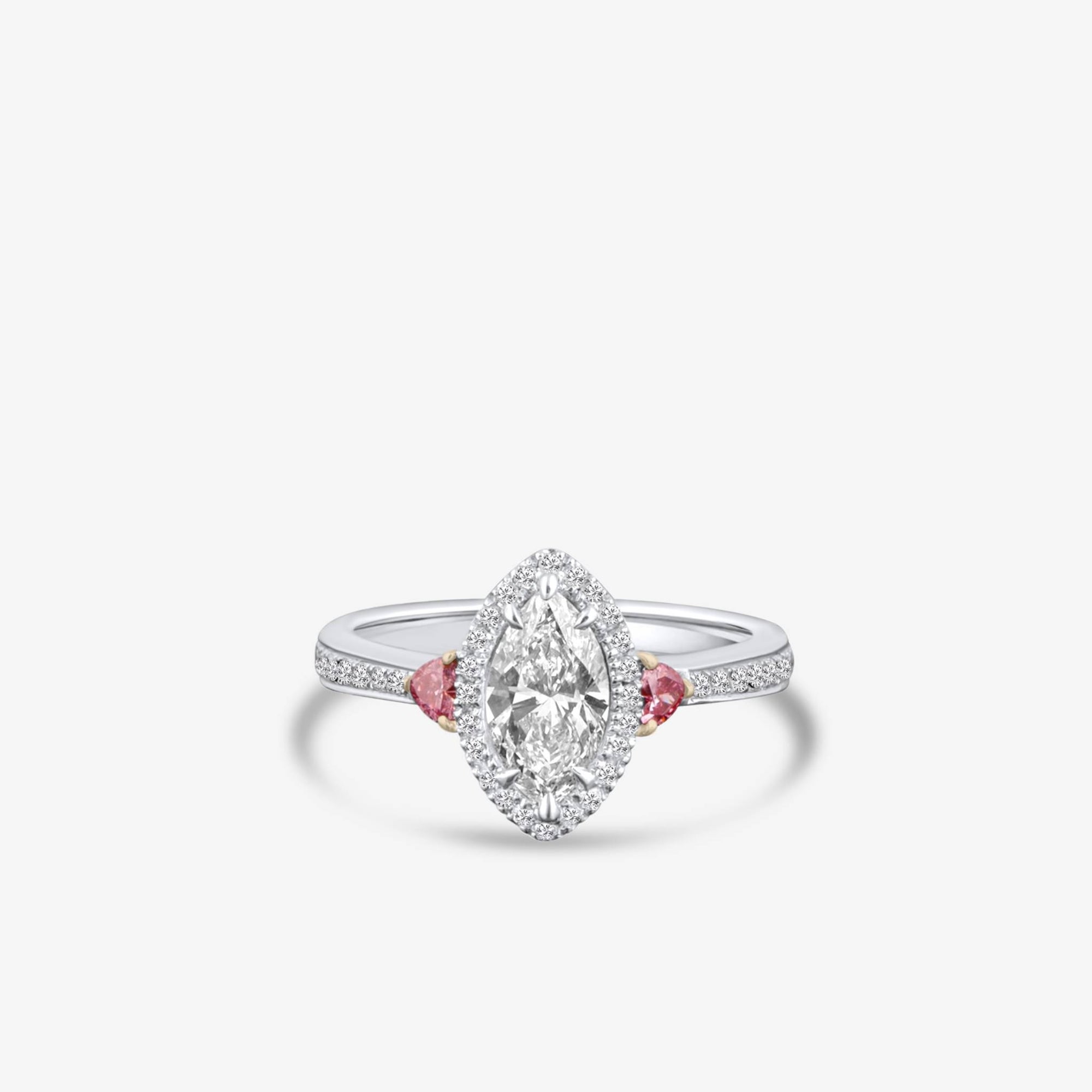 A platinum ring featuring a flawless and D color marquis diamond that is flanked by two natural pink diamond heart shaped diamonds.