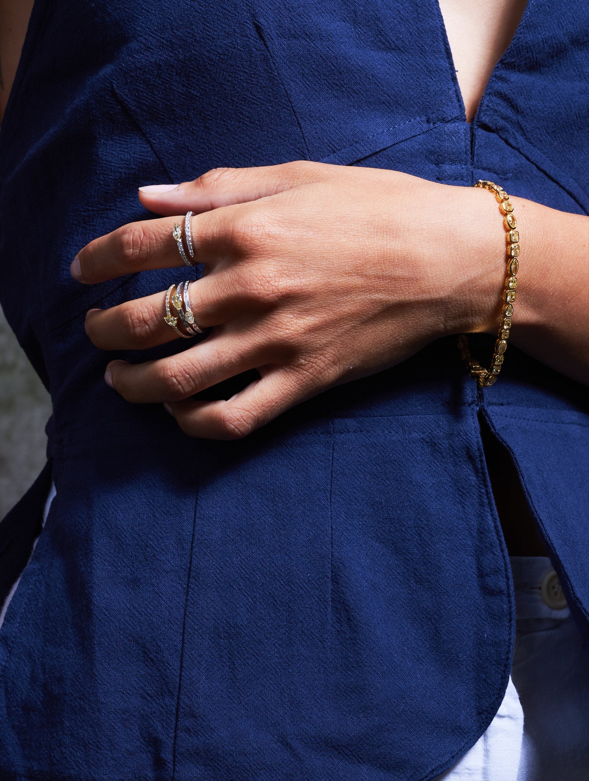 A yellow emerald cut diamond set in 18K yellow gold is wrapped in a white gold channel setting with white diamond baguettes.