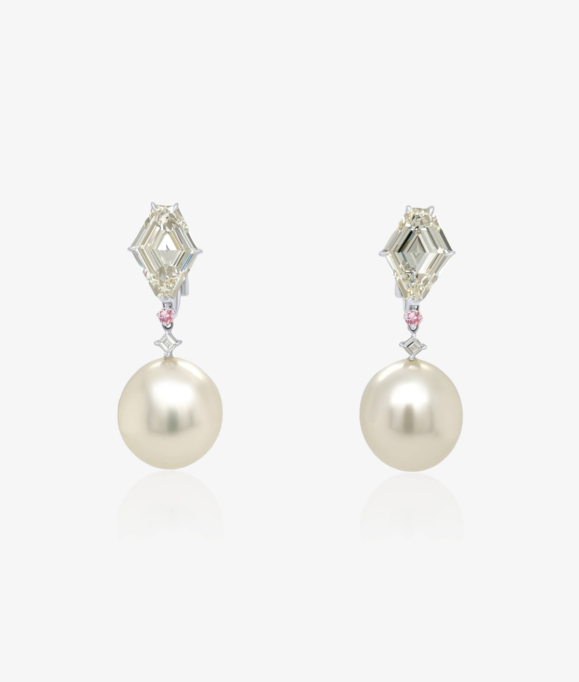 Wonderfully elegant and elongated south sea pearls set in earrings with shield shaped diamond tops. There are natural vivid pink diamonds in the center.