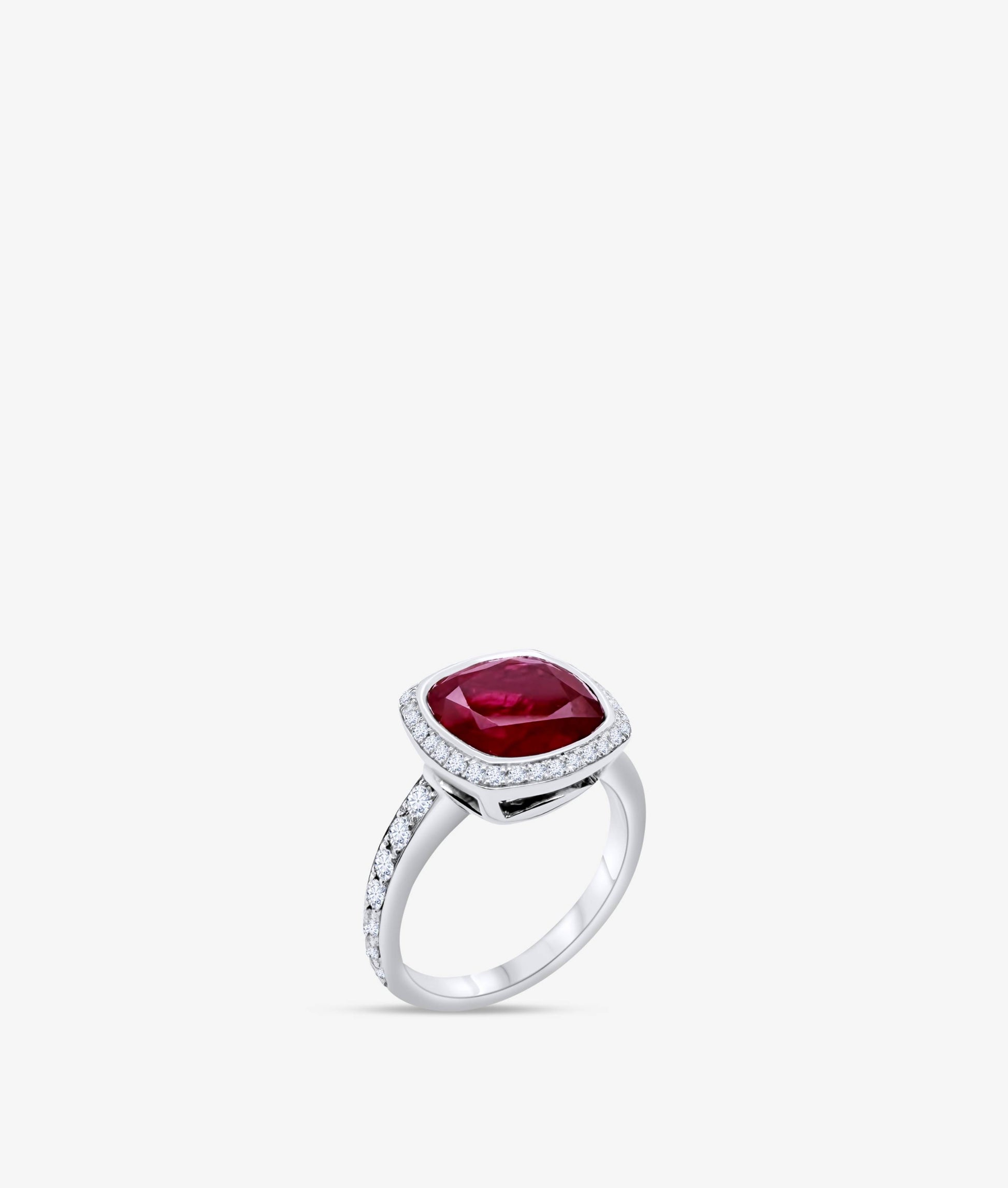 A ring centering a natural untreated Burmese ruby cushion set in white gold with of diamonds.