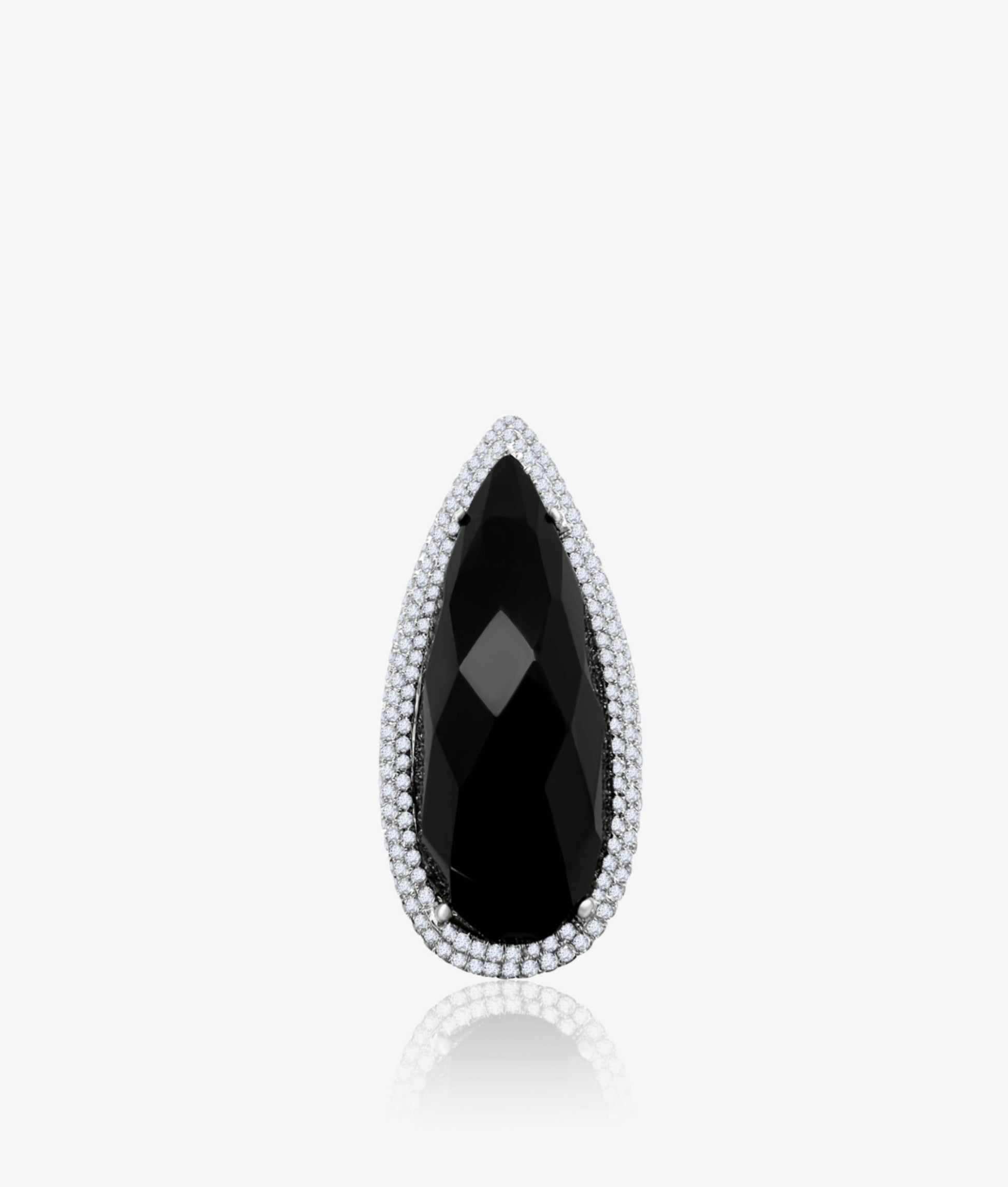 A bold 18K white gold ring featuring a pear shaped onyx, accented with brilliant-cut diamonds.