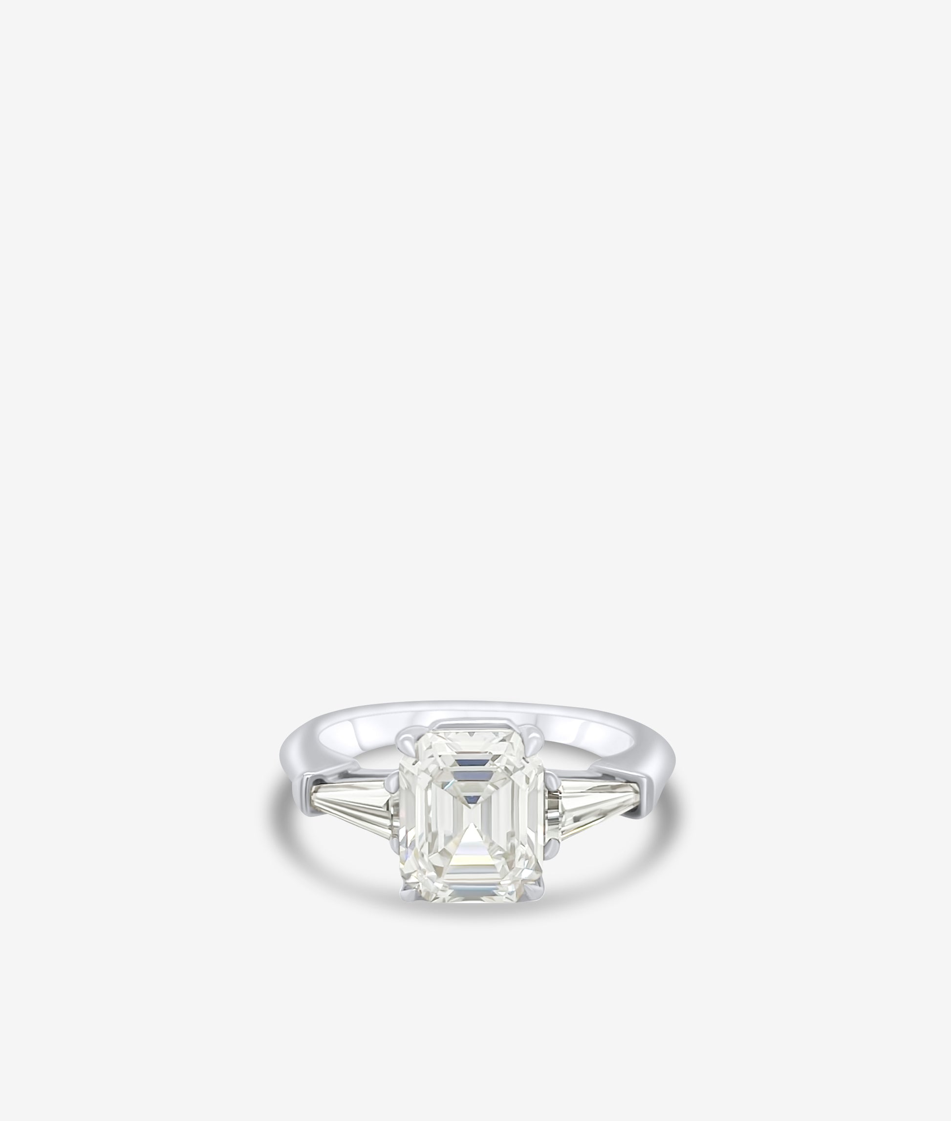 The perfect emerald cut ring made out of platinum with a rectangular step cut D IF diamond, finished with 2 bright tapered diamonds