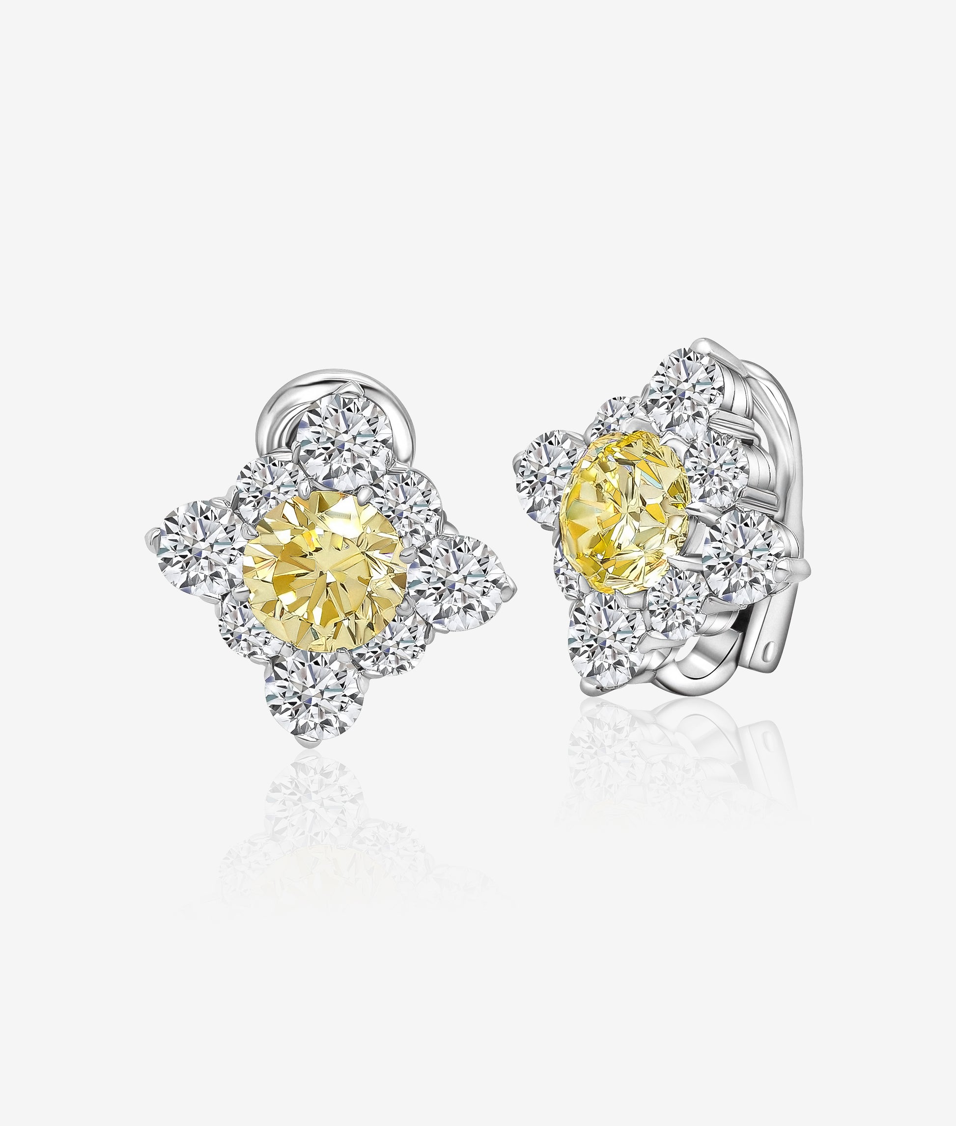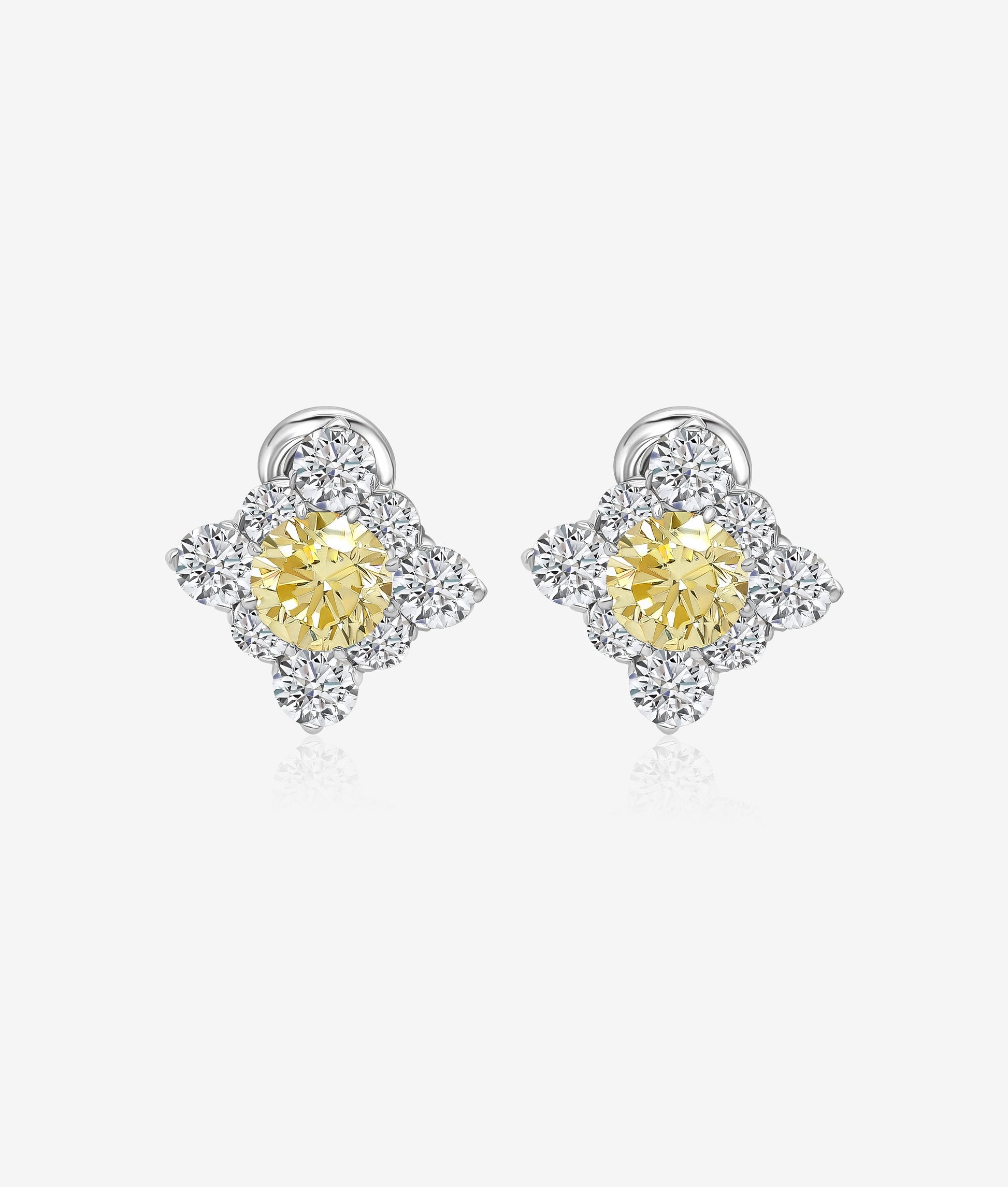 Platinum earrings with bright round brilliant fancy yellow diamonds, each framed by four white diamonds.