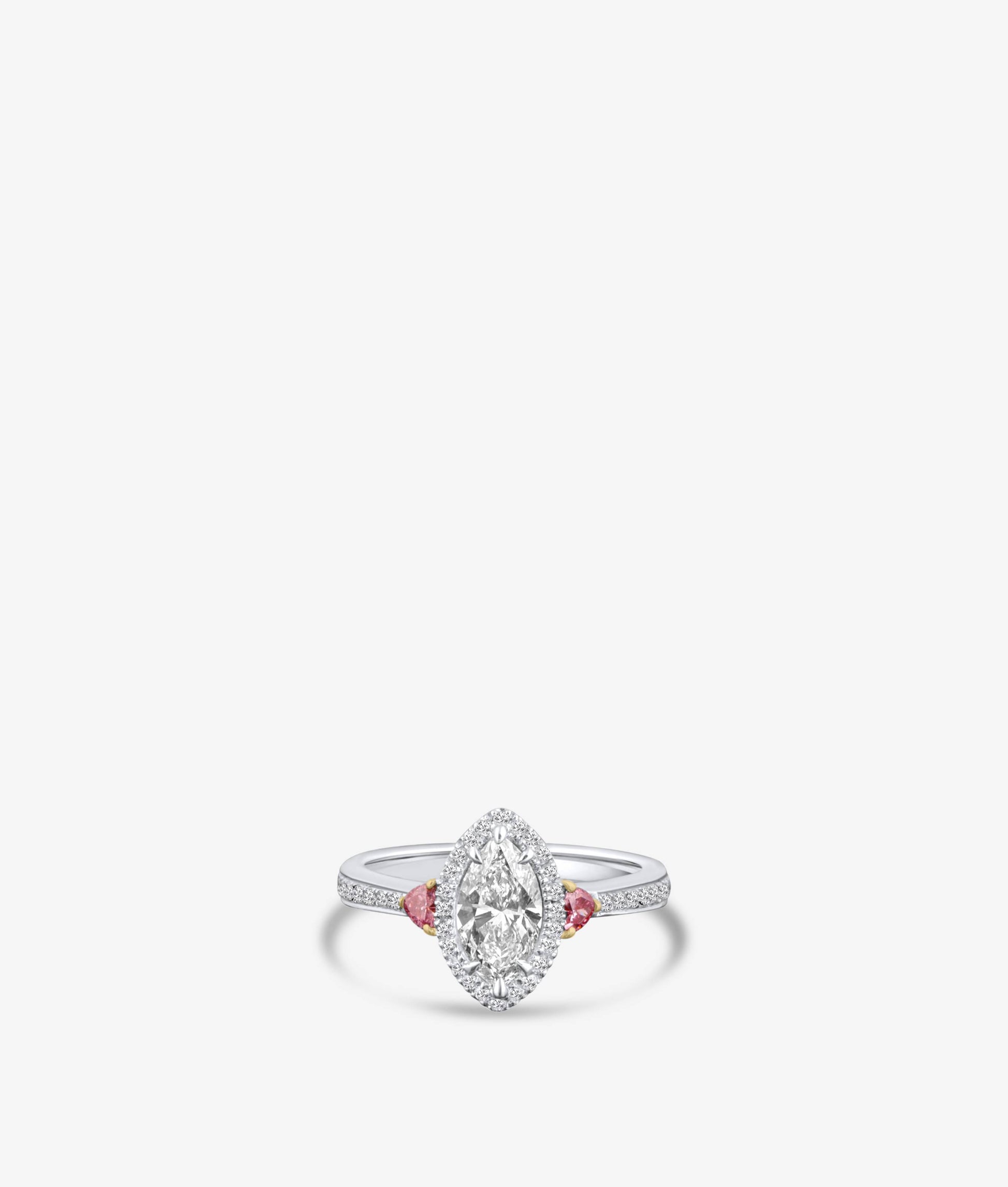 A platinum diamond ring, centering a perfect D IF marquise diamond, flanked with pink heart shaped diamonds and colorless diamonds.