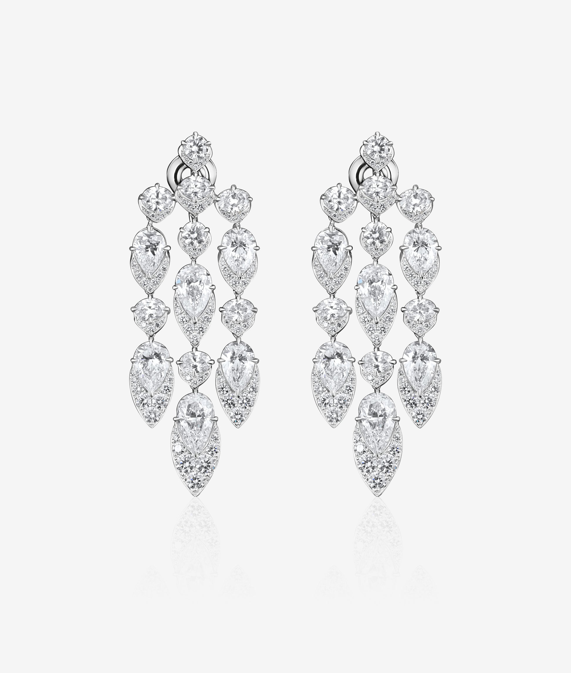 Expertly crafted diamond earrings with a mix of round and pear shaped diamonds.