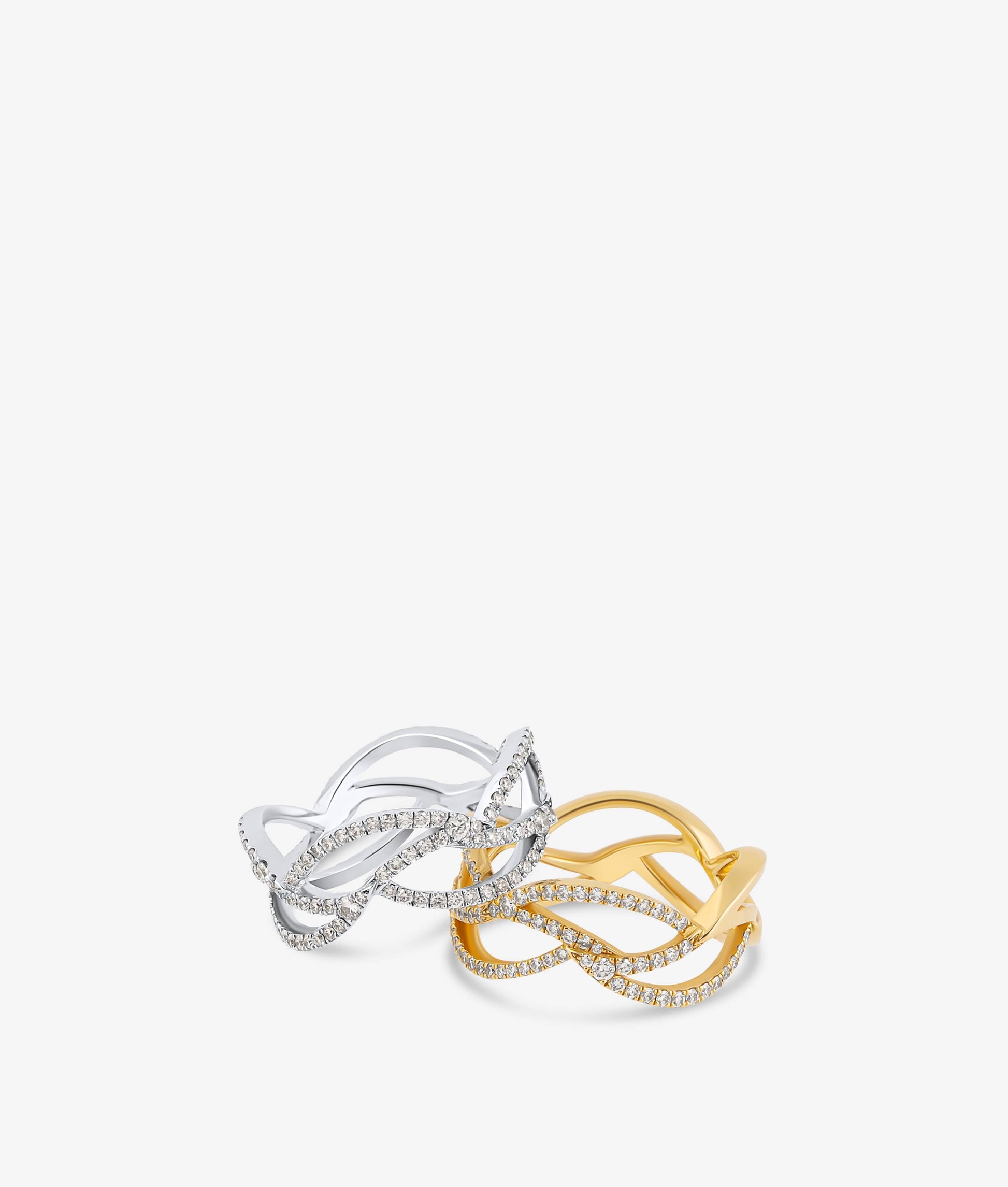 A ring set in 18K yellow gold set with pave diamonds in a waved shape.