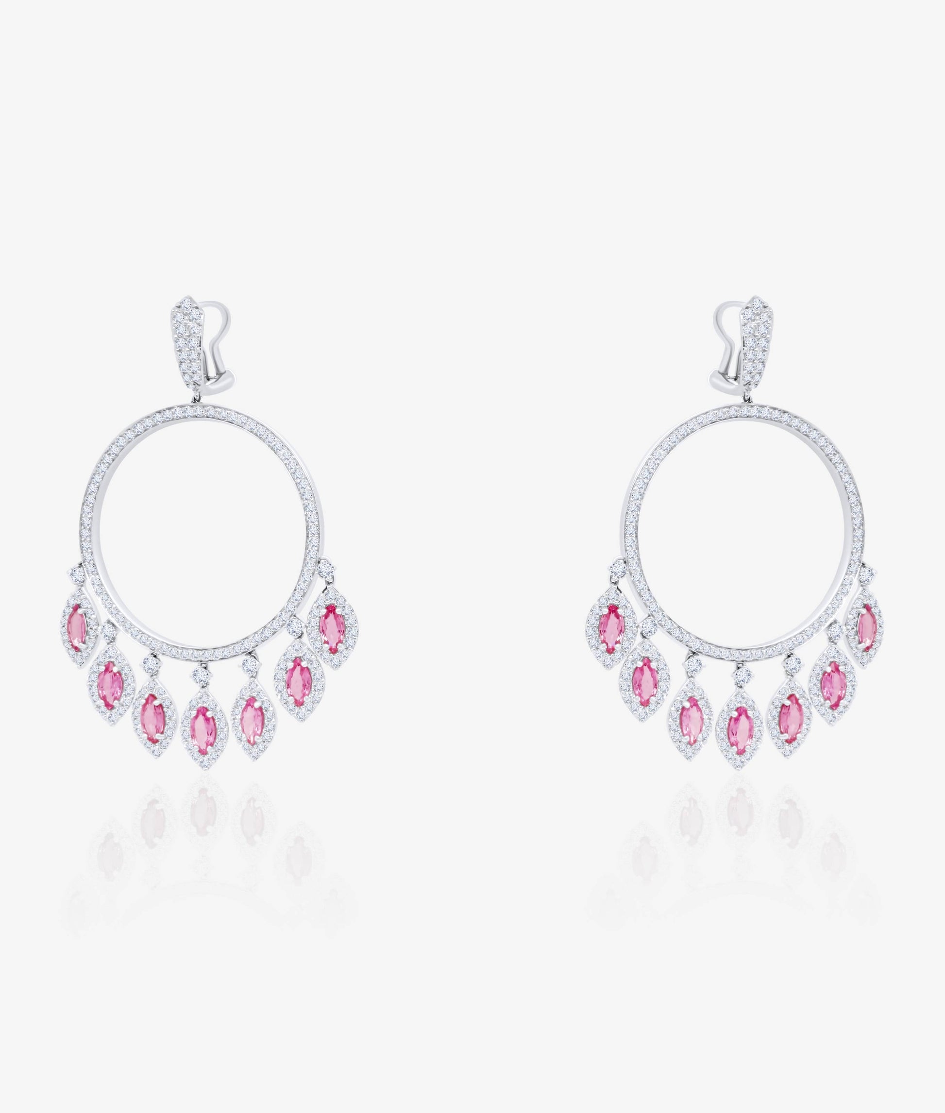 Gypsy style earrings with white diamonds and marquis shaped pink sapphires.