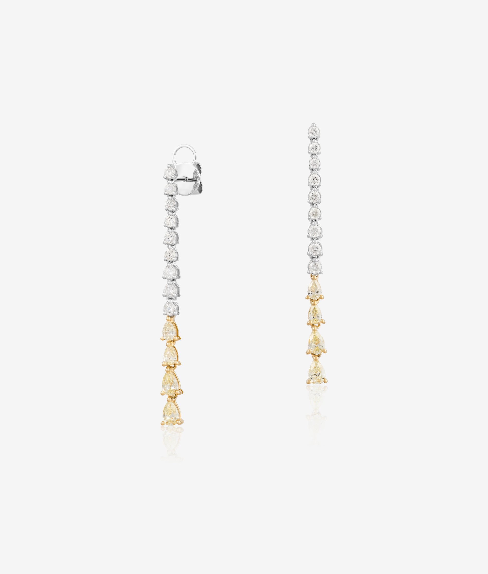 A pair of drop earrings crafted in 18K yellow and white gold, set with a row of white round diamonds and yellow pear shaped diamonds.
