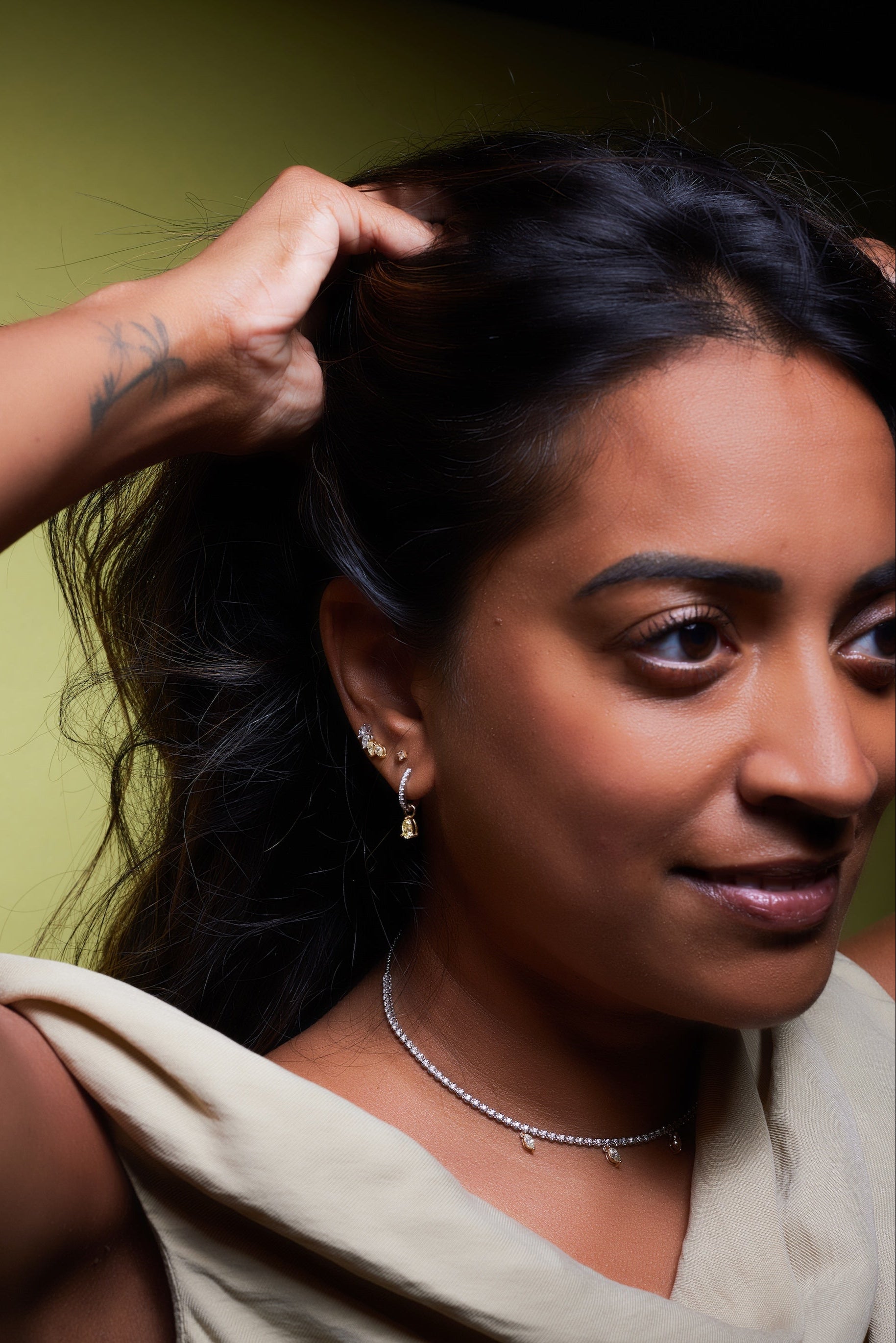 A pair of earring hoops crafted in 18K gold, set with white round diamonds and yellow pear shaped diamond hanging below.