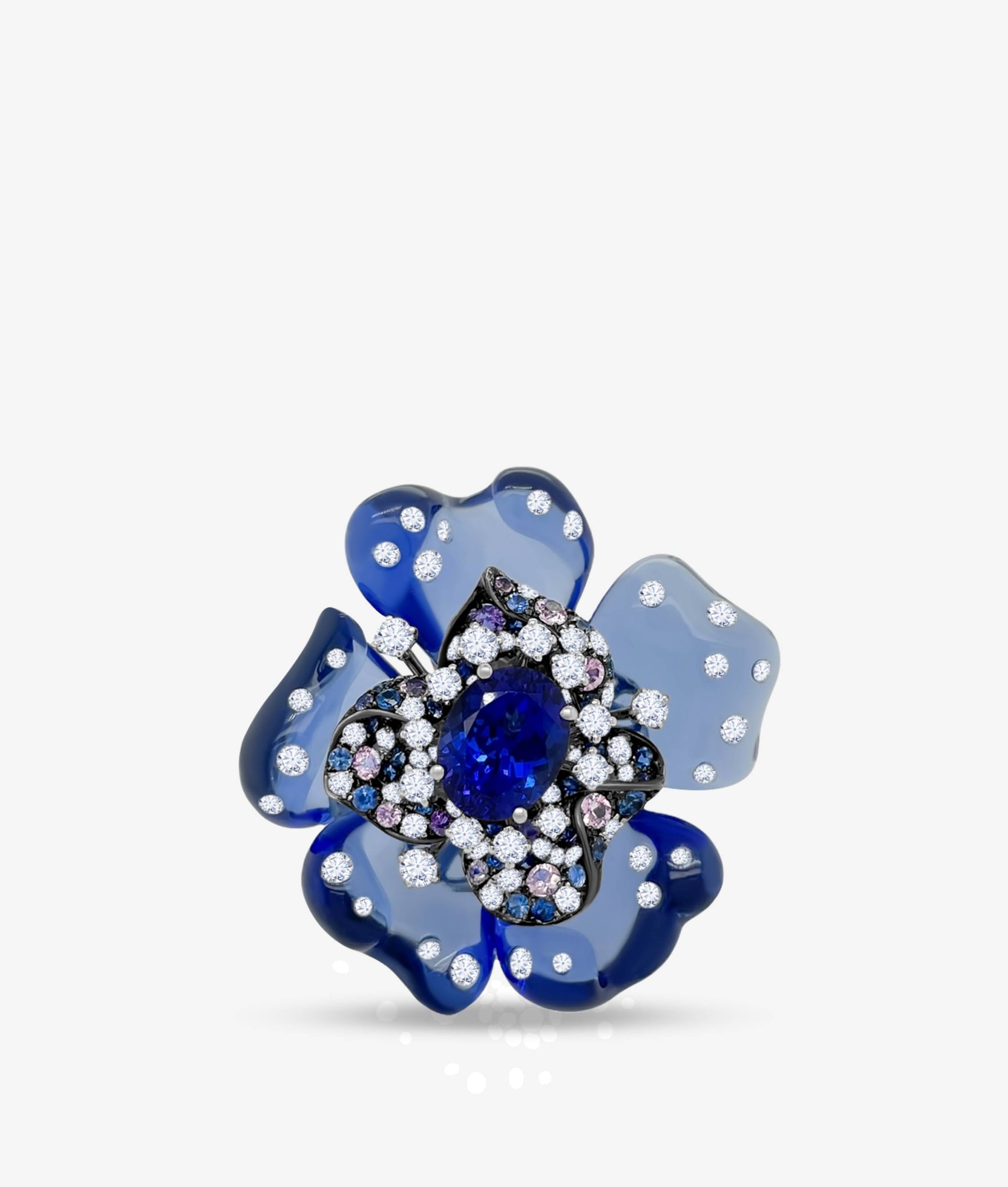 There are 5 petals made of polished slices of Tanzanite that are decorated with clusters of brilliant cut diamonds and pink sapphires.