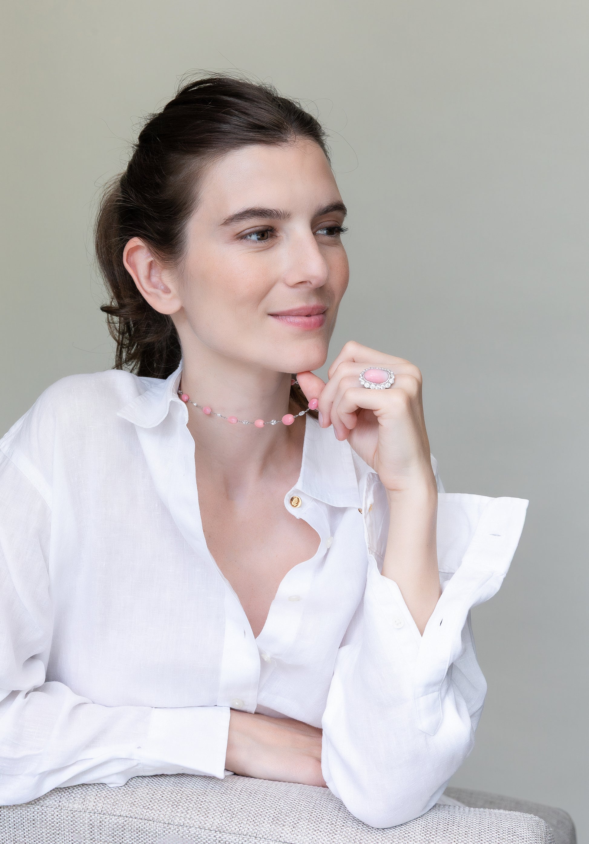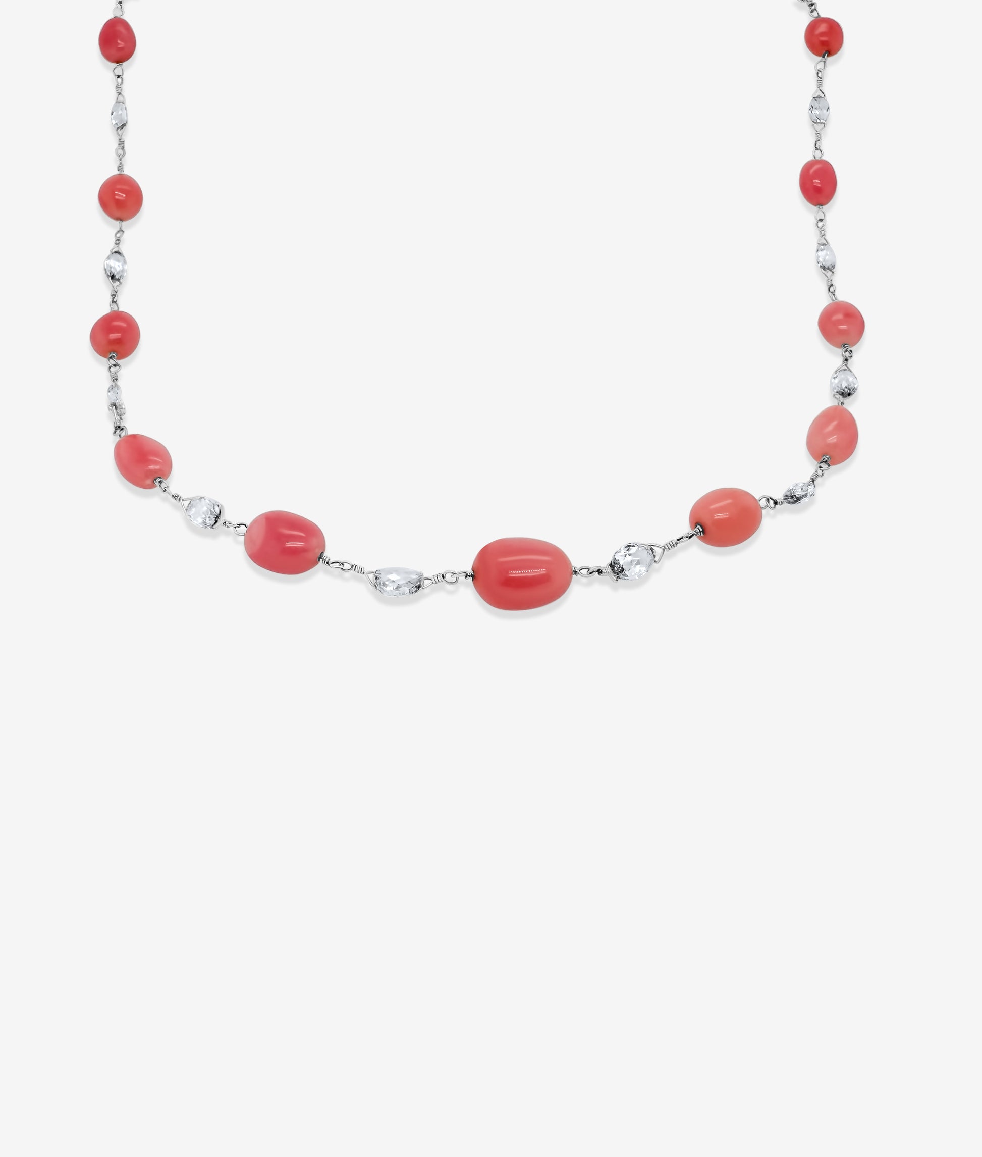 A diamond and conch pearl platinum necklace set with 18 fine conch pearls alternate with 19 briollette white diamonds