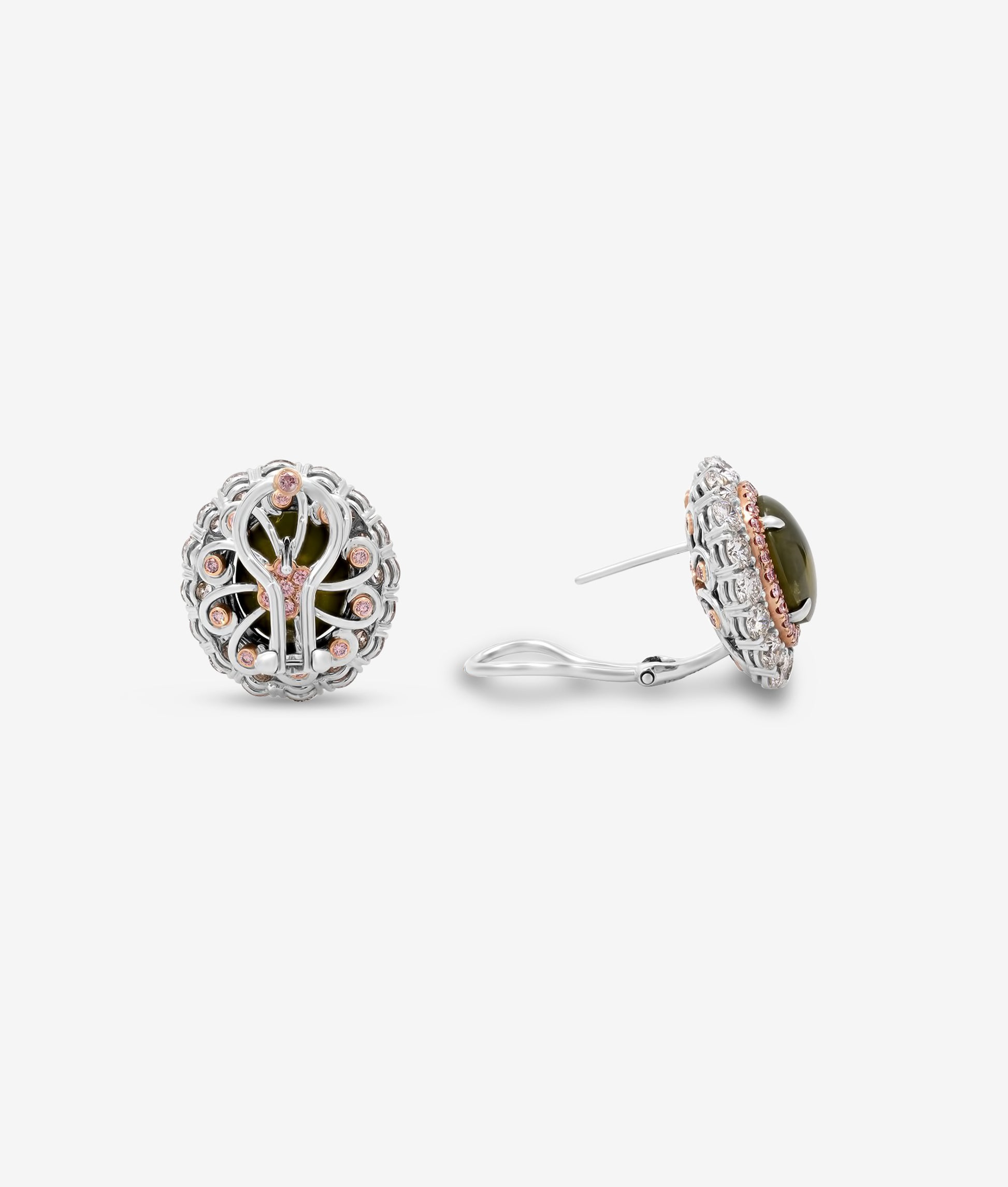 A pair 18k white gold earrings set with natural green chrysoberyl cat's eye cabochons, finished with pink and colorless diamonds.