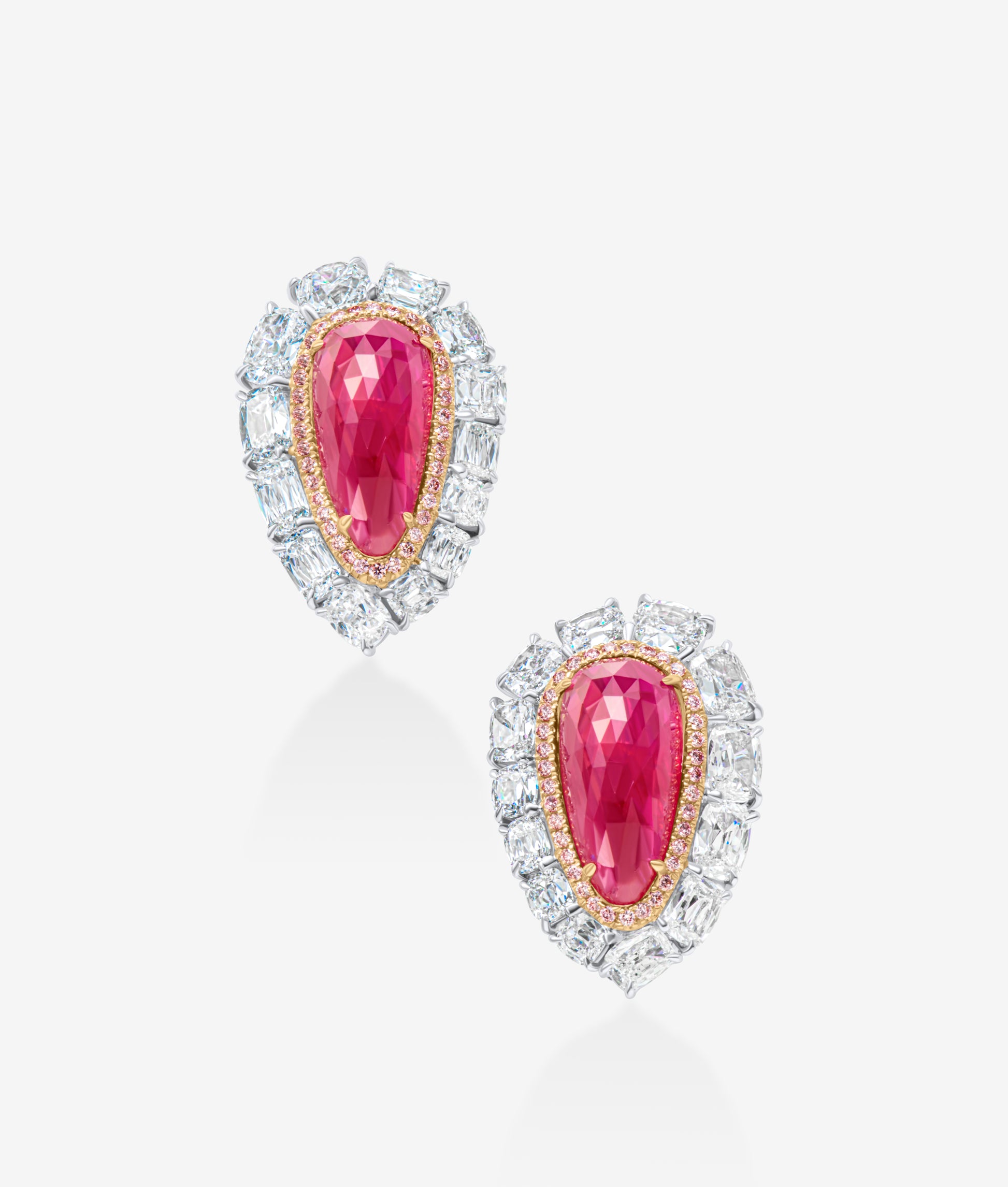 A pair of Burmese ruby rose cut/ pear shaped earclips surrounded by diamond cushions.Between the white diamonds and rubies there are pink diamonds.