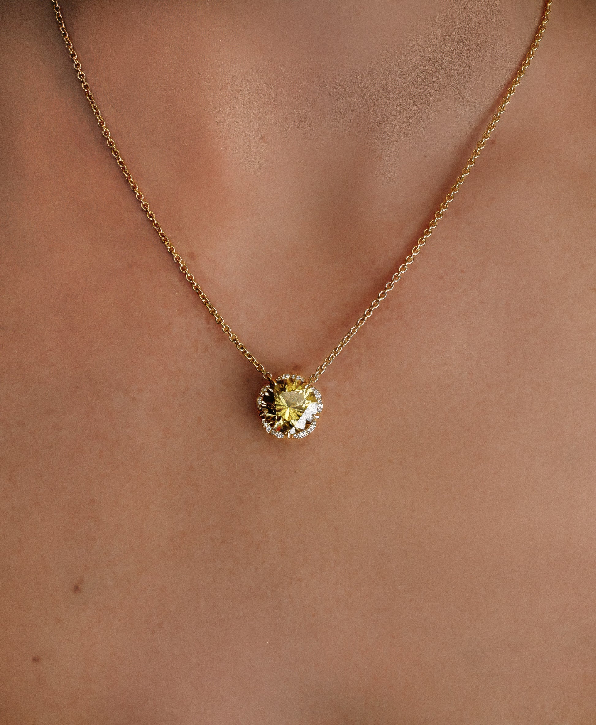 18k rose gold necklace set with a natural fancy orange brown diamond pendant.
