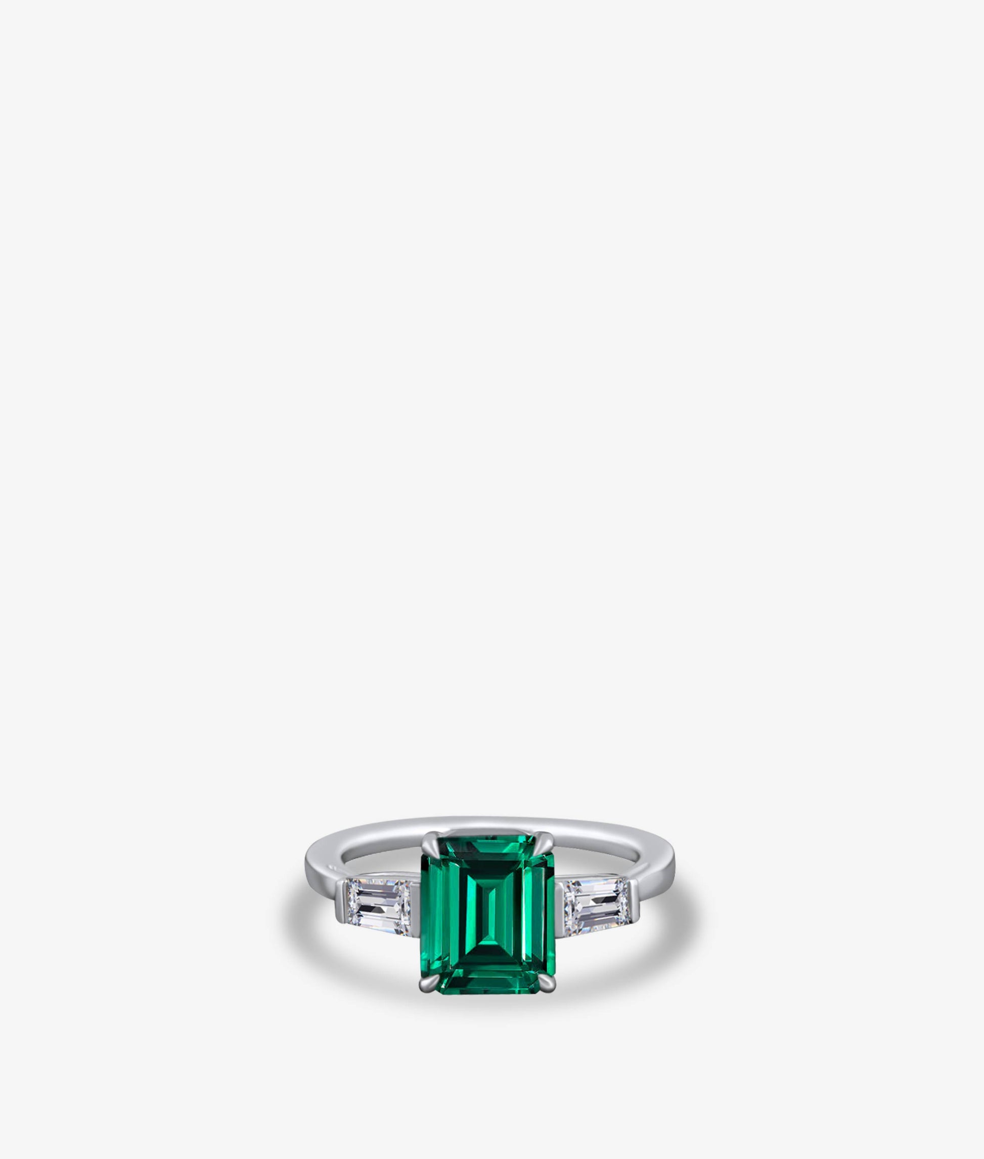 An emerald ring of Brazilian origin with two trapezoid diamonds side stones.