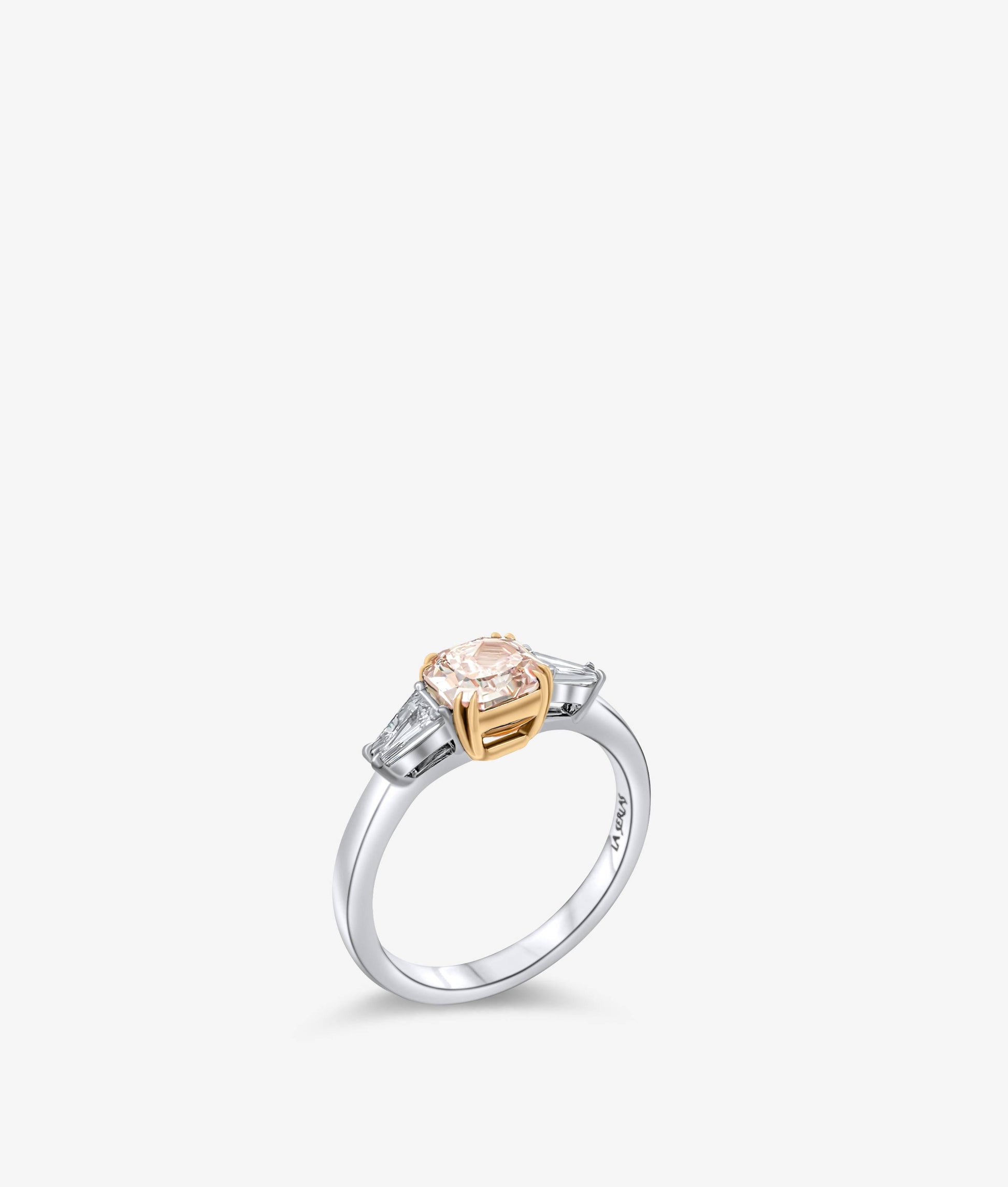 A radiant cut fancy light brownish pink diamond set in an 18k gold ring with two tapered baguette side stone diamonds.