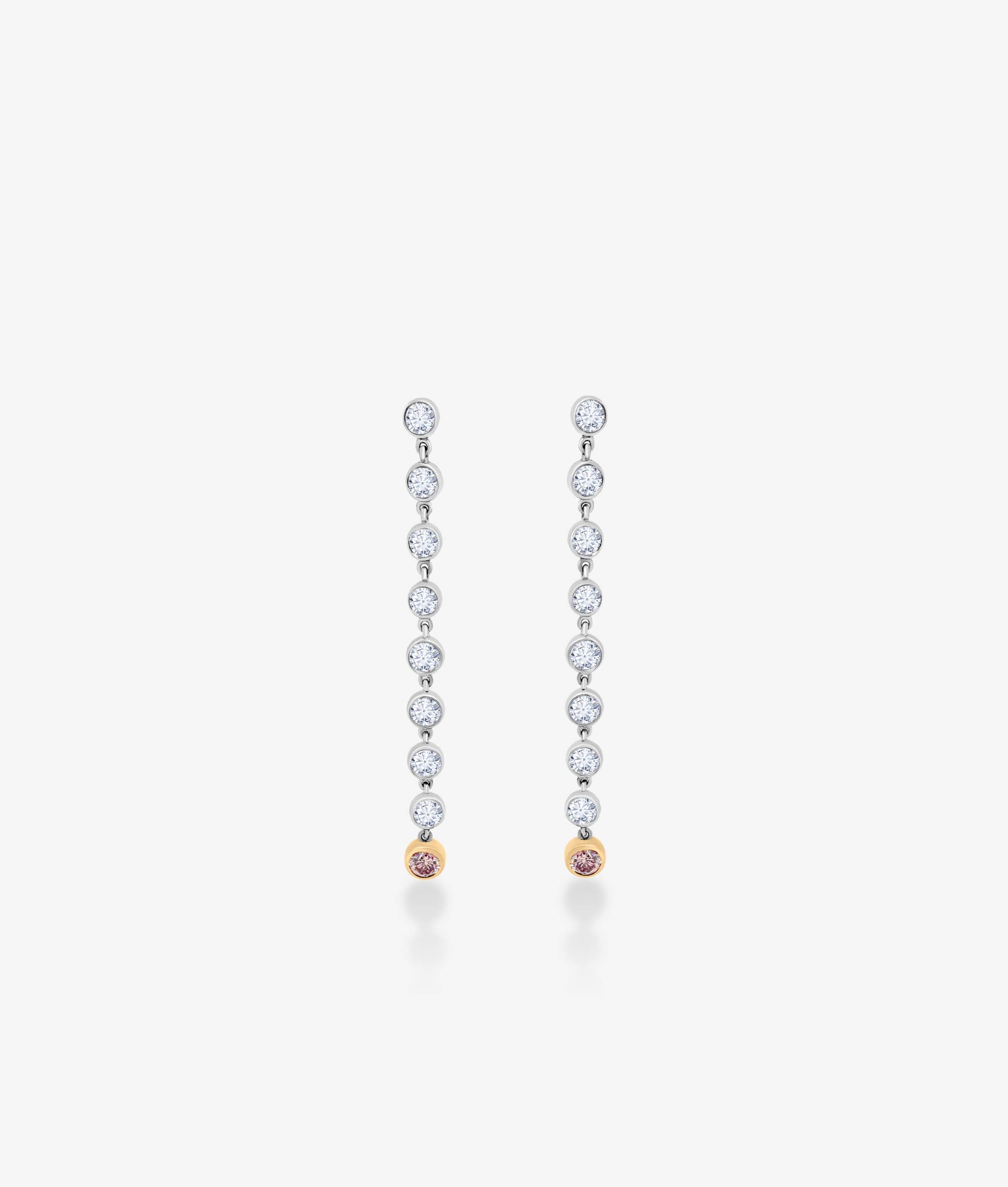 Bezel-set diamond row earrings in 18K white gold, accented with pink diamond brilliants and the bottom set in rose gold.