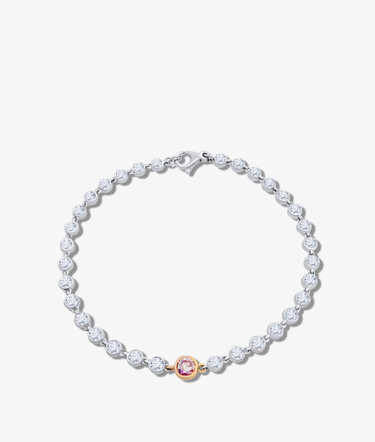 A classic tennis bracelet featuring round brilliant diamonds in sleek bezel settings, handcrafted in 18K gold and crowned with a single round pink diamond.