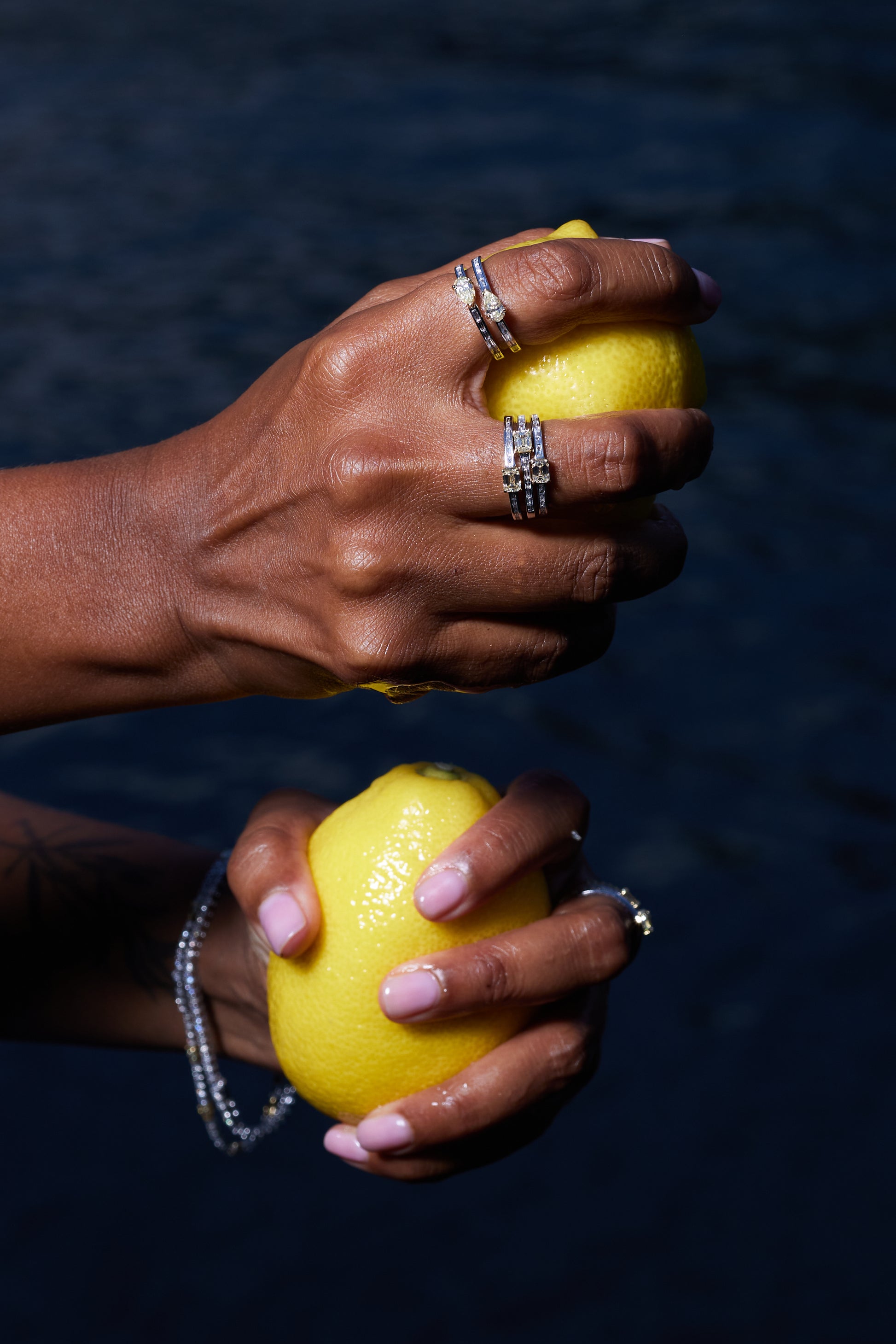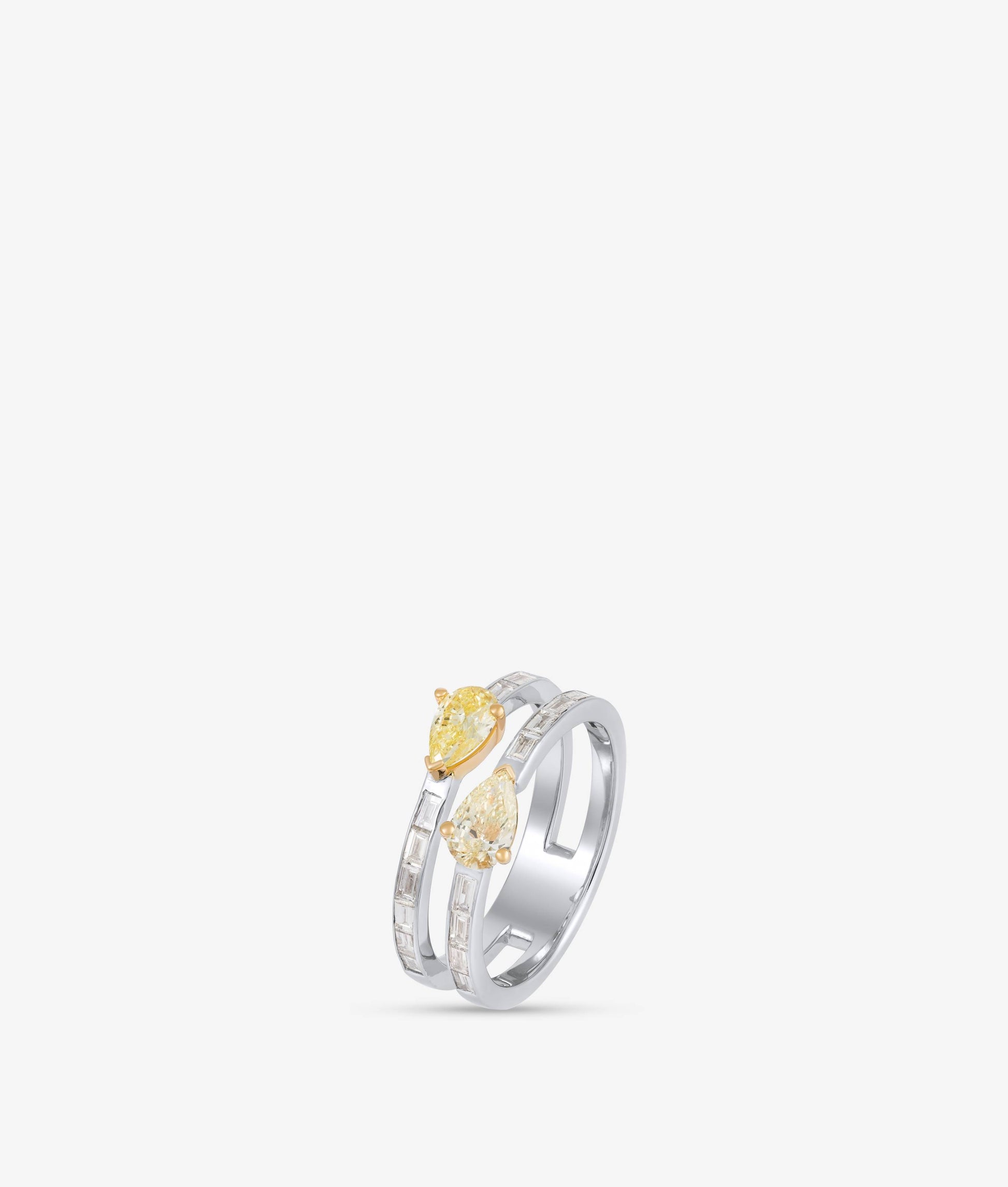 A ring crafted in 18K white and yellow gold, set with two rows of white baguette diamonds set in a channel setting and a yellow pear shaped diamond on each row.